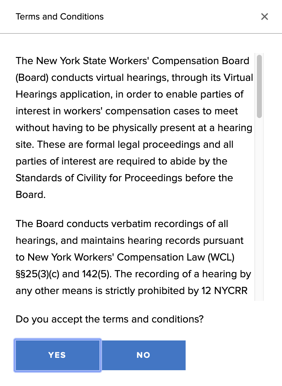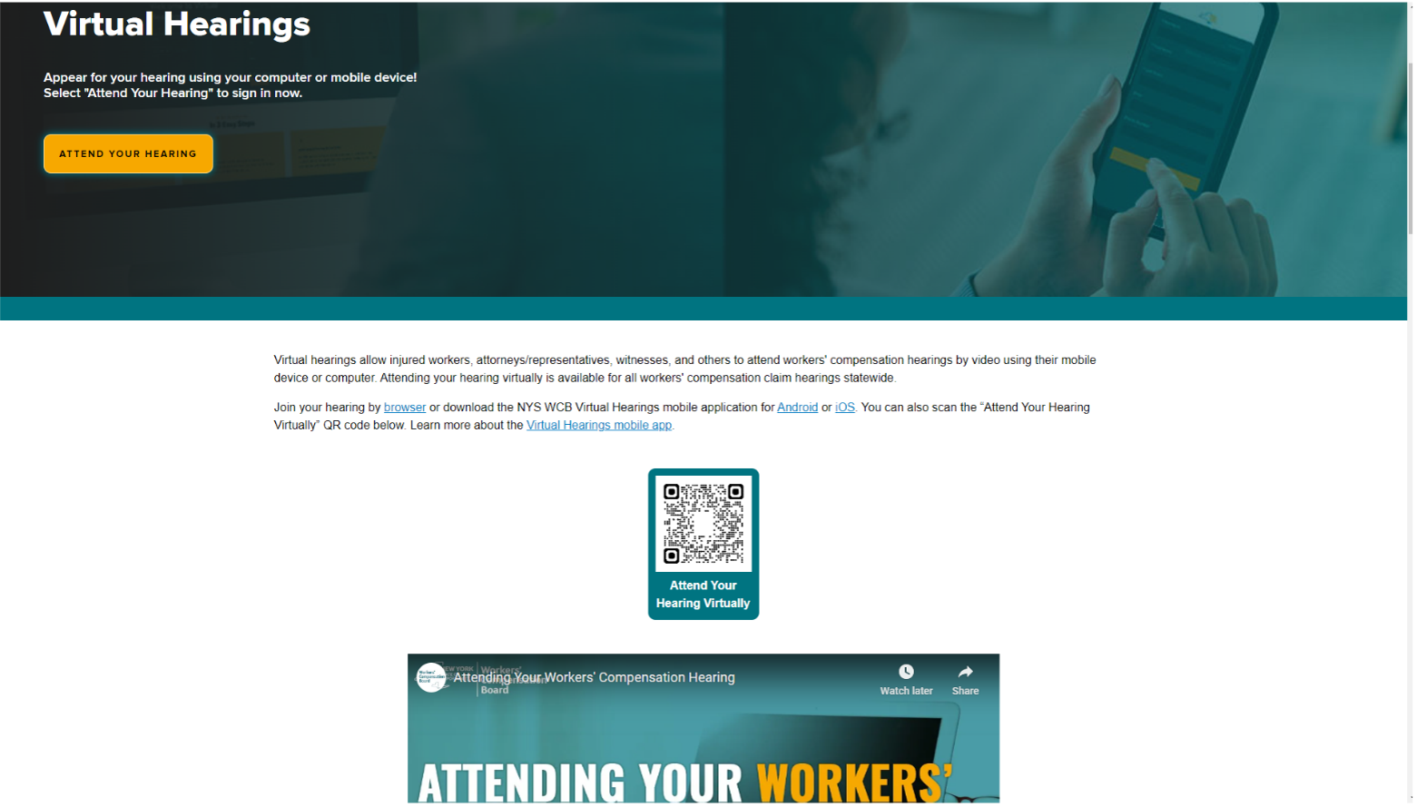 If you need to attend your hearing by phone call, please call the Customer Service Center: (844) 337-6301. Reminder: All represented claimants testifying in virtual hearings are required to appear and testify by video with their faces fully visible on screen. For more information, visit: wcb.ny.gov/virtual-hearings.