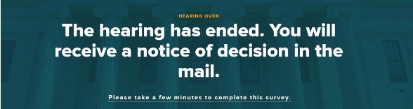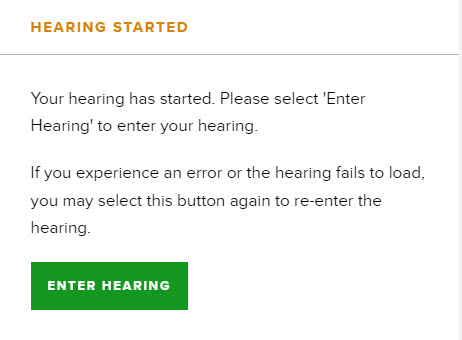 - When your hearing is called, you will see a message on your Waiting Room dashboard indicating that your hearing will begin. You will then hear a chime, and a pop-up message will appear to notify you that your hearing has started. When this pop-up message appears, select Enter Hearing to enter the hearing room.