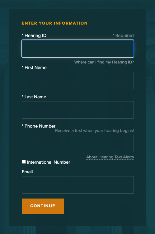 - Enter your Hearing ID, first name, last name, email (optional), and phone number. Enter a mobile phone number to receive text message notifications when your hearing has started. Select the "International Number" button if you are entering an international telephone number. Select Continue.