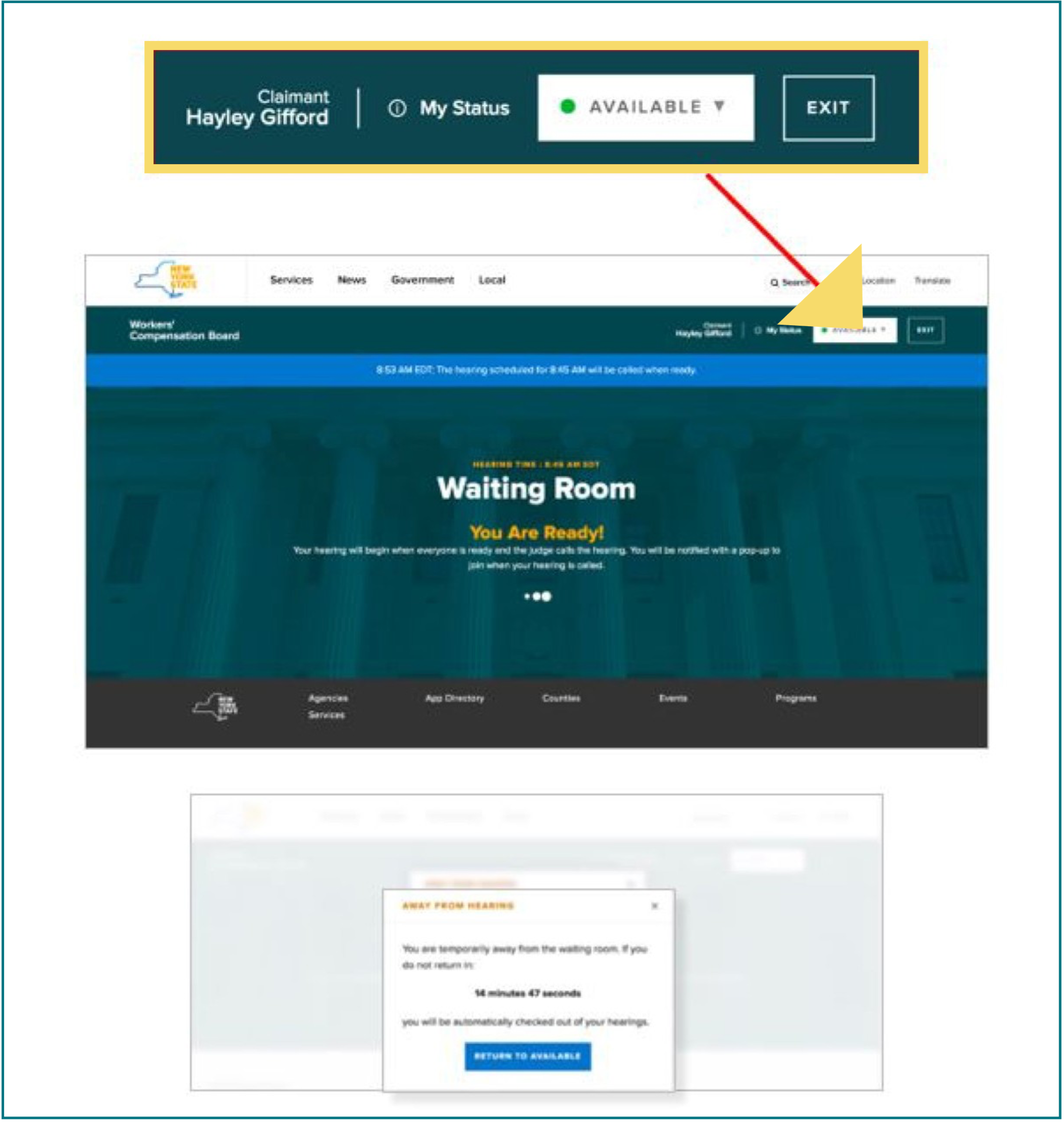 - For various reasons, the judge may take a temporary break in the proceedings and then recall your hearing. If that happens, go back to the tab titled NY WCB VHC Waiting Room and wait for the judge to call you in again.